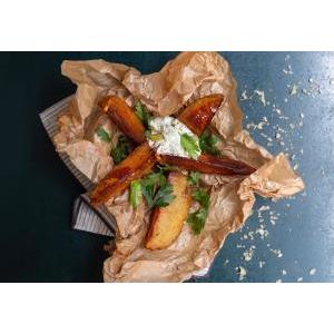 Aubergine confite, persil plat, oignons rouges, citron confit, téhina, sésame torréfié