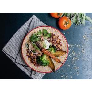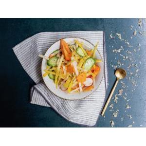 Poitrine de Veau cuite 12h effilochée, carottes braisées, crème raifort, concombre sauvage, tomate cerise, salade frisée et