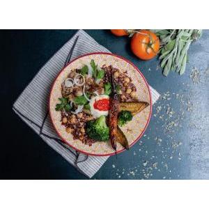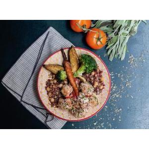 Haché de boeuf et de veau, menthe - persil plat, échalotes, mélange d’épices maison, oeuf au plat, téhina, concombre sauvage, tomate cerise, salade frisée et légumes « vivants »