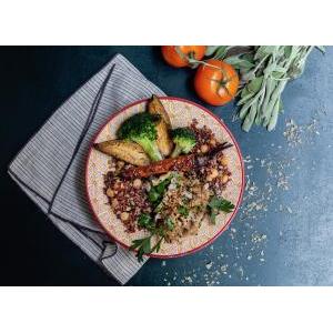 Aubergine confite, persil plat, oignons rouges, citron confit, téhina, sésame torréfié, concombre sauvage, tomate cerise, salade