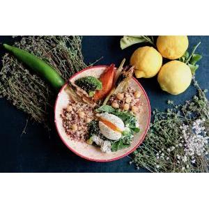 Poulet doucement rôti et grillé, menthe - cébette - coriandre, zhug et citron confit, fromage blanc turc