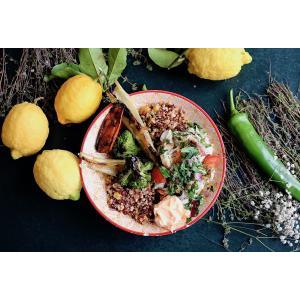 Fleurettes de chou fleur rôti, tomate cerise, cebette, citron confit, zhug, sésame torréfié, fromage blanc turc